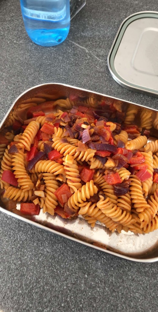 Ich habe 80g Nudeln mit 2 gehackten Knoblauchzehen angebraten. Anschließend kam noch eine kleine rote Zwiebel und eine rote Paprika hinein in die Pfanne. Ein halber Teelöffel Tomatenmark sowie Pfeffer und Chillisalz dazu und fertig ist das Essen 💪🏻.