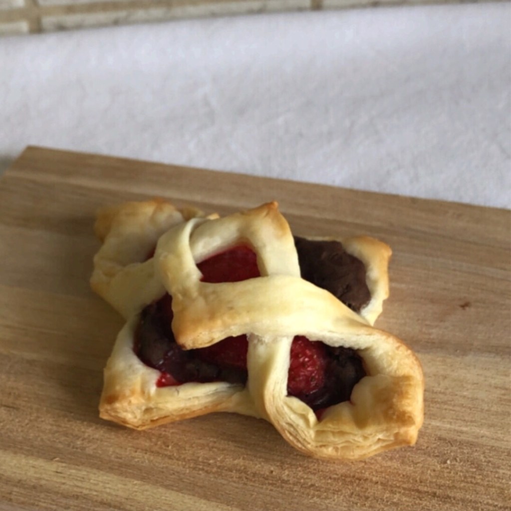 - Auf das Blätterteigquadrat etwas Proteincreme geben. Darauf zwei Erdbeerhälften legen und die Ecken einschlagen.