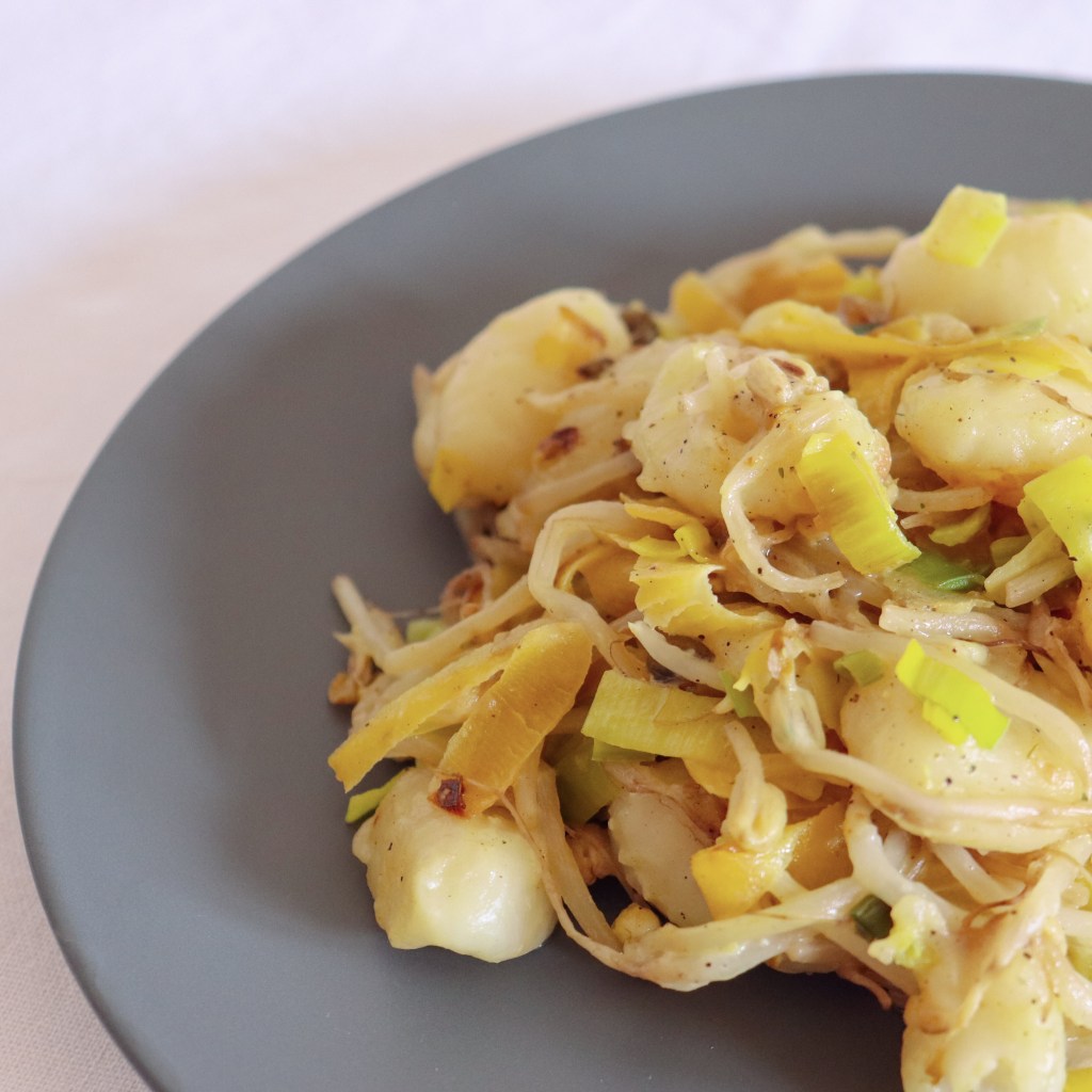 - Gemüse mit Kokosöl in einer Pfanne anbraten während die Gnocchi kochen (Verpackungsanleitung beachten)