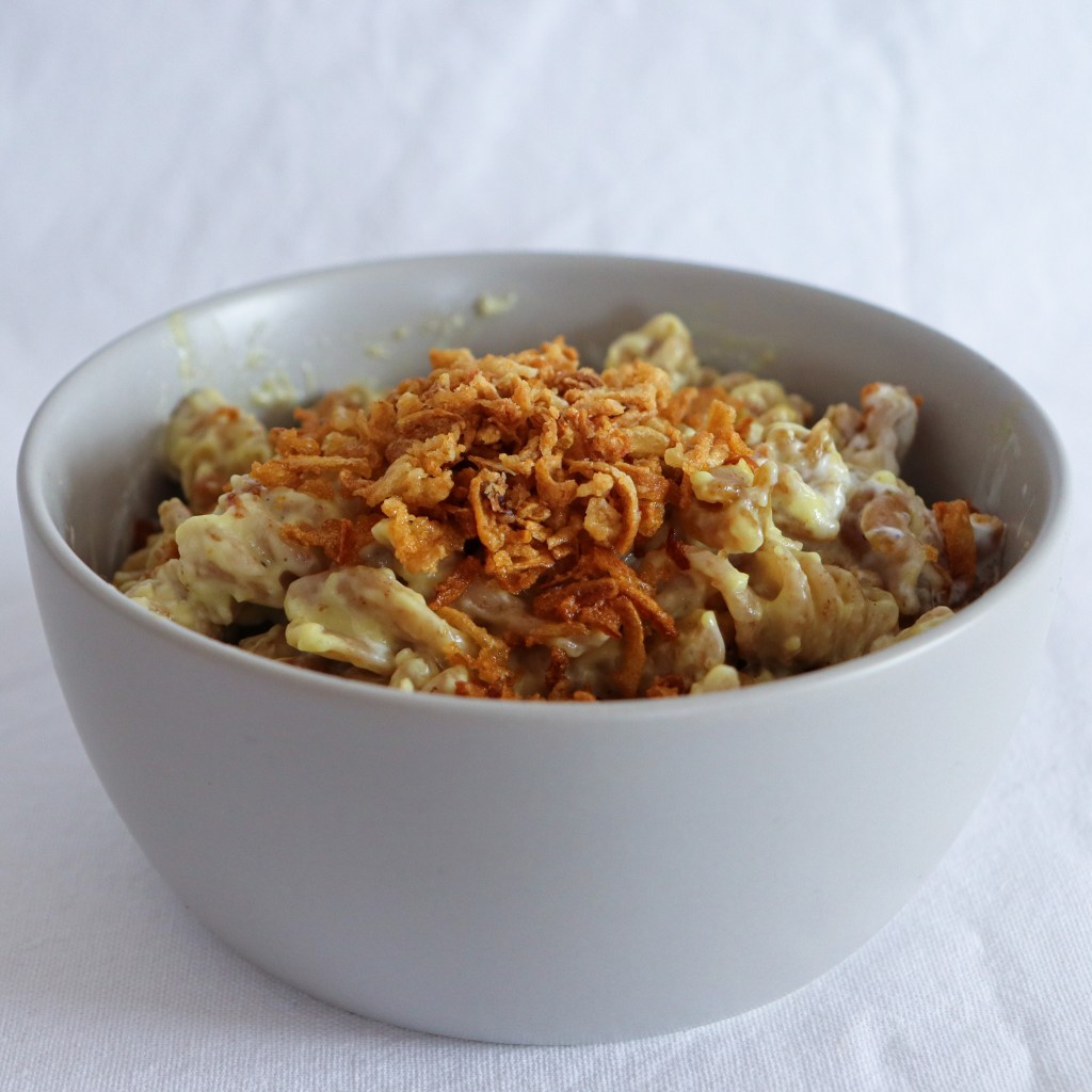 - Mac´n´Cheese servieren und Röstzwiebeln darüber geben.
