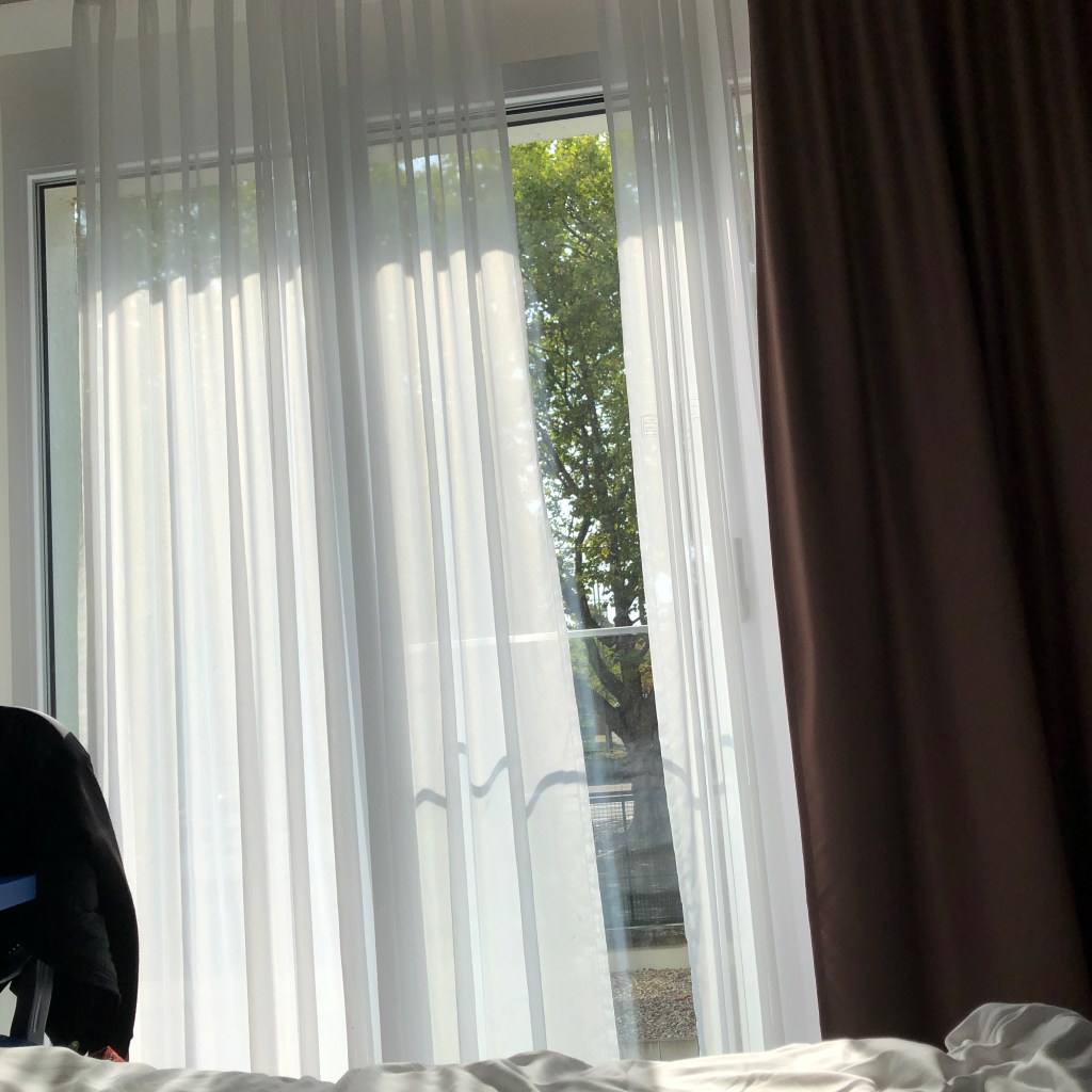 Das Zimmer zeigt zum Residenzschloss hin. Vorhänge sorgen hier auch für Privatsphäre.