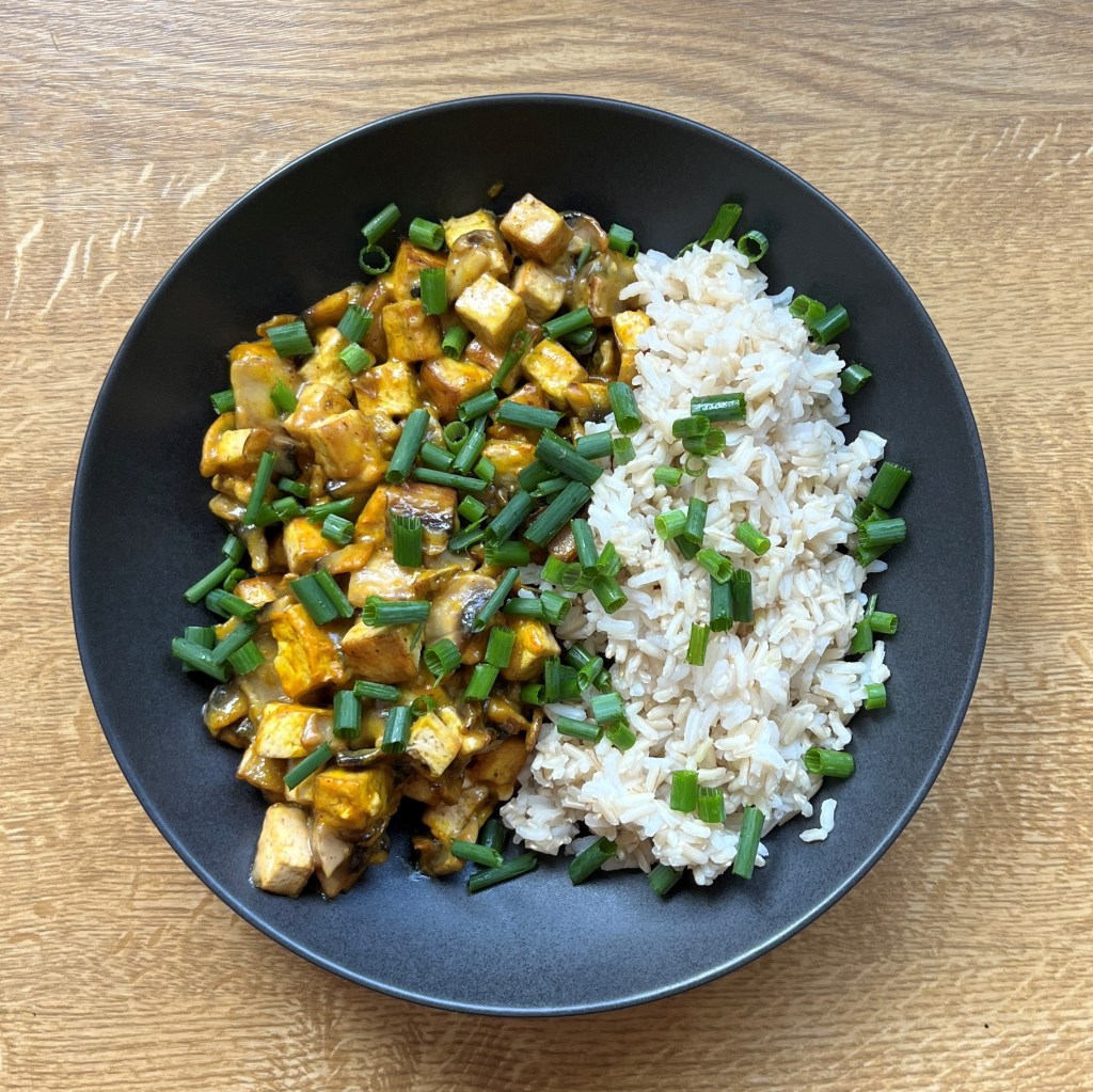 - Tofu mit Olivenöl in einer Pfanne anbraten und würzen (z.B. Salz, Pfeffer, Paprika edelsüß, Kurkuma). Wenn der Tofu goldgelb wird können die Champignon hinzugefügt werden. Nach ca. 5 Minuten braten die Soja Cusine dazugeben und nochmal gut durchmischen.