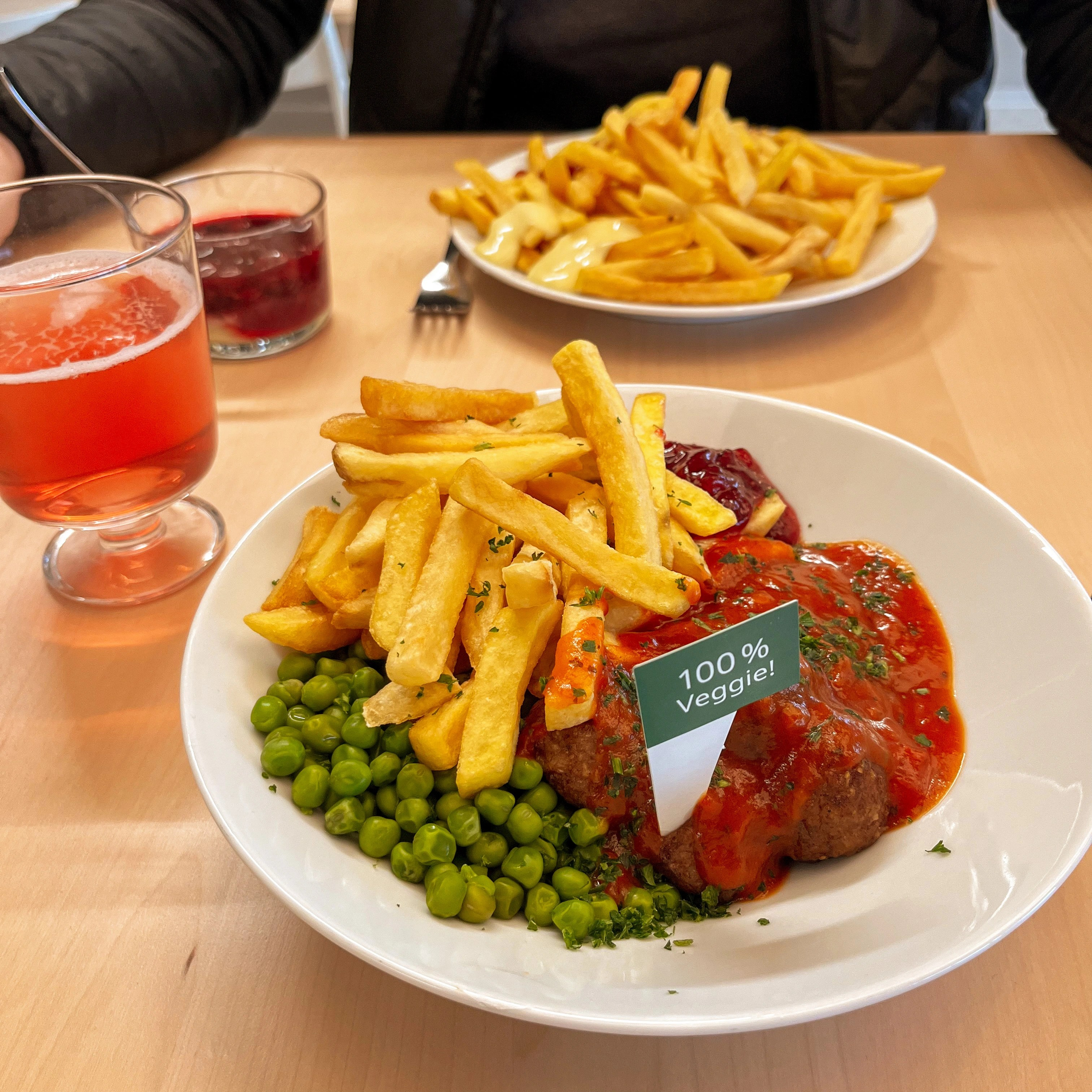 - Plantbullar mit grünen Erbsen, Tomatensoße, Pommes und Preiselbeeren (vegan)